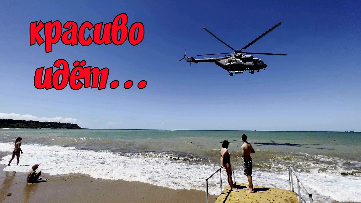 Крым.Вертолёт пролетел слишком низко над пляжем в Учкуевке,пугая отдыхающих