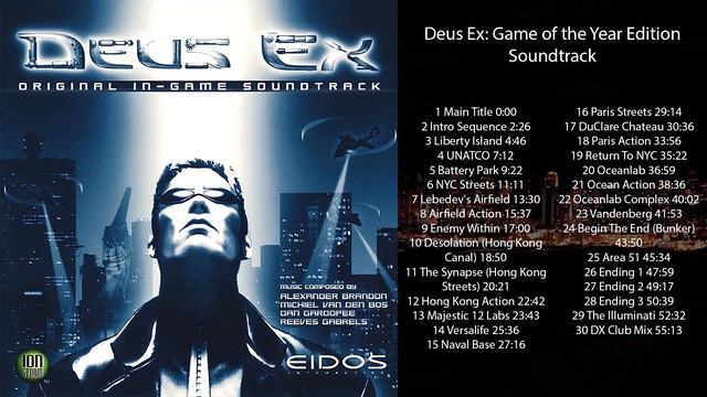 00:00 Main Title 02:26 Intro Sequence 04:46 Liberty Island 07:12 UNATCO 09:22 Battery Park 11:11 NYC Streets 13:30 Lebedev's Airfield 15:37 Airfield Action 17:00 Enemy Within 18:50 Desolation (Hong Kong Canal) 20:21 The Synapse (Hong Kong Streets) 22:42 Hong Kong Action 23:43 Majestic 12 Labs 25:36 Versalife 27:16 Naval Base 29:14 Paris Streets 30:36 DuClare Chateau 33:56 Paris Action 35:22 Return To NYC 36:59 Oceanlab 38:36 Ocean Action 40:02 Oceanlab Complex 41:53 Vandenberg 43:50 Begin The End (Bunker) 45:34 Area 51 47:59 Ending 1 49:17 Ending 2 50:39 Ending 3 52:32 The Illuminati 55:13 DX Club Mix Deus Ex: Game of the Year Edition Soundtrack — саундтрек к компьютерной игре Deus Ex, вышедший отдельным диском в составе специального издания Game of the Year Edition в 2001 году. В альбом вошли композиции, звучавшие в игре. Игра была отмечена за красивую и разнообразную музыку, характеризующуюся необычайной атмосферностью и многожанровостью, при том что написана она целиком и полностью с использованием трекера. Основные жанры — техно и эмбиент, но также нельзя не отметить присутствие или, по крайней мере, влияние таких жанров, как дарквейв, неоклассика, а также джаз, рок и метал. Все треки были написаны Александром Брэндоном, Дэном Гардопи и Михилом ван ден Босом при участии гитариста Ривза Гэбрелса.