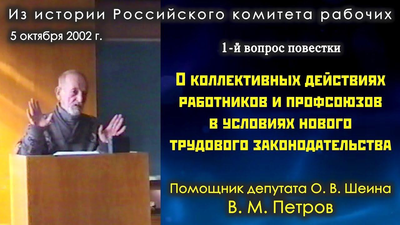 Запись из архива Фонда Рабочей Академии. Семинар Российского комитета рабочих, Нижний Новгород, 05.10.2002. 1-й вопрос повестки, 2-й докладчик. «О коллективных действиях работников и профсоюзов в условиях нового трудового законодательства». Виктор Михайлович Петров, помощник депутата Государственной Думы Олега Васильевича Шеина. Ведут заседание рабочие Дмитрий Васильевич Игошин и Василий Иванович Шишкарёв. 00:00:14 - докладчик Виктор Михайлович Петров. 00:27:43 - по регламенту Василий Иванович Шишкарёв, сопредседатель Российского комитета рабочих, наладчик ЗИЛ, член РПР, г. Москва. 00:29:33 - перерыв. 00:31:41 - Иван Петрович Казаков, рабочий ВНИИ экспериментальной физики, член профсоюзного объединения "Защита труда", г. Саров. 00:47:40 - Александр Юрьевич Аргунов, председатель Межрегионального профсоюза «Железнодорожник», г. Ленинград. 01:04:47 - Лев Исаакович Лерман, главный инспектор СоцПроф Нижегородской области. 01:13:35 - Алексей Анатольевич Зуйков, начальник отдела охраны труда ООО «Промэнергогаз-2», Нижний Новгород. 01:21:39 - Владимир Михайлович Кудрявцев, регулировщик радиоаппаратуры, завод Электромаш, член РПР, Нижний Новгород. 01:31:53 - Анатолий Петрович Шумаков, модельщик завода Ивтекмаш, представитель РКР по Ивановской области, член РПР, г. Иваново. 01:35:28 - Владимир Михайлович Кудрявцев, регулировщик радиоаппаратуры, завод Электромаш, член РПР, Нижний Новгород. 01:51:50 - докладчик с проектом постановления - Михаил Васильевич Попов, профессор СПбГУ, кафедра экономики и права, консультант портового комитета Российского профсоюза докеров морского порта г. Санкт-Петербурга, консультант РКР, г, Ленинград. Как вступить в Рабочую партию России: http://www.r-p-w.ru/kak-vstupit-v-rabochuyu-partiyu-rossii.html ___ Для пожертвований в Фонд Рабочей Академии: Карта Сбербанка: 5469550034869302 Михаил Васильевич П. _ Карта Альфа-банка: 4154812035337157 _ _ ___ Веб-сайт Рабочая партия России: http://www.r-p-w.ru РПР ВКонтакте https://vk.com/rabparty Сайт Северо-кавказского отделения РПР https://rpw-krd.ru Рекомендуем программы для скачивания видео и звука с нашего видеоканала: TubeMate - есть на сайте 4pda (для Android), MediaHuman YouTube Downloader - есть на торрентах (для Windows).