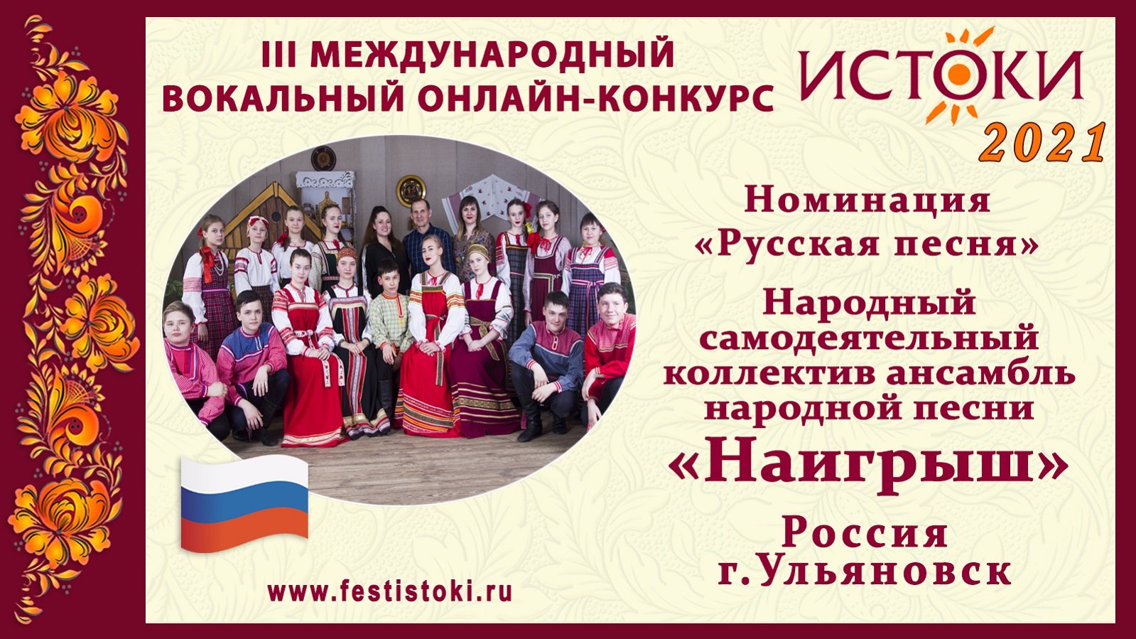Лауреат II степени III Международного вокального онлайн-конкурса «Истоки». Номинация "Русская песня". Плясовая песня Ульяновской области "Как во поле, поле". Сайт: www.festistoki.ru / www.festistoki.com E-mail: festistoki@mail.ru