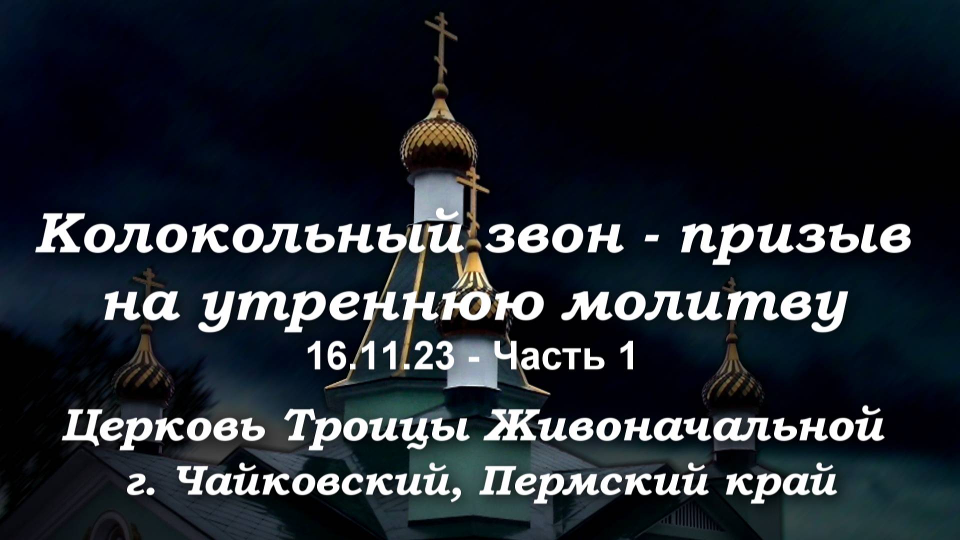 Этот колокольный звон на колокольне церкви Троицы Живоначальной (г. Чайковский Пермский кр.) записан утром 16 ноября 2023г. с разрешения и благословления Благочинного отца Георгия. Запись была сделана перед началом службы, т. е. этим колокольным звоном народ призывается в храм на молитву. Поэтому эта часть имеет номер 1 и принципиально отличается от колокольного звона после окончания службы. Приношу свою благодарность за помощь в организации съемок отцу Иоанну и отцу Сергию и, конечно, матушке Ольге, которая и воспроизвела этот колокольный звон. У меня в планах смонтировать и опубликовать еще несколько видео колокольного звона с другими исполнителями. Все они люди творческие и у каждого свои оригинальные приемы и манера звона. Всем добрым людям желаю здоровья, счастья, оптимизма и всего доброго в наступающем Новом 2024 году !