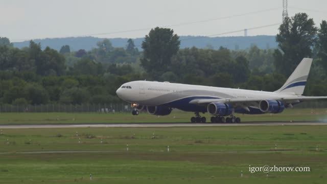 24 июля 2017 года, аэропорт Дюссельдорф (DUS/EDDL), Германия. Airbus A340-542 CS-TFX португальской авиакомпании Hi Fly приземляется на ВПП 23R. Самолёту 17 лет, первый полёт 18 июля 2008 года. Борт предназначался для индийской авиакомпании Kingfisher Airlines (VT-VJE), но коммерческих полётов в ливрее этой авиакомпании борт не совершал. С 29 апреля 2009 года самолёт в составе флота нигерийской авиакомпании Arik Air (CS-TFX).Самолёт носит имя “Captain Bob Hayes”. С 8 июня 2015 года в составе флота авиакомпании Hi Fly. Компоновка салона - 36 мест бизнес-класса, 201 место эконом-класса. В октябре 2018 года выведен из эксплуатации и находится на хранении в аэропорту Тарб-Лурд Пиренеи (LDE, Франция). * Airbus A340 of Hi Fly landing in Dusseldorf DUSSELDORF, GERMANY - JULY 24, 2017: Side view, Airbus A340-542, CS-TFX of Hi Fly landing and touchdown, braking, deceleration at Dusseldorf Airport. Charter airline of Portugal. Travel concept #Airbus,#A340,#HiFly,#Dusseldorf,#DUS #CSTFX,#ArikAir,#KingfisherAirlines,#AvGeek,#spotting
