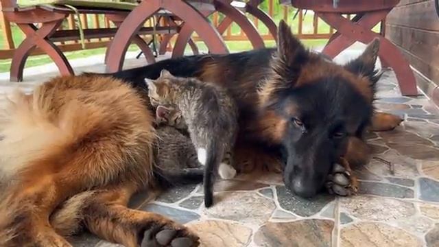Котята спят с немецкой овчаркой
