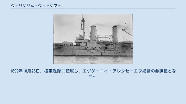 ヴィリゲリム・ヴィトゲフト, by Wikipedia https://ja.wikipedia.org/wiki?curid=1255086 / CC BY SA 3.0 #ロシア帝国の提督 #日露戦争で戦死した人物 #聖ウラジーミル勲章受章者 #聖アンナ勲章受章者 #聖スタニスラフ勲章受章者 #ロシア帝国のドイツ人 #ヘルソン県出身の人物 #オデッサ出身の人物 #1847年生 #1904年没 ヴィリゲリム・カールロヴィチ・ヴィトゲフト(ロシア語:Вильгельм Карлович Витгефтヴィリギェーリム・カールラヴィチュ・ヴィードギフト;ドイツ語:Wilhelm Karlowitsch Withöftヴィルヘルム・カルロヴィッチュ・ヴィートヘフト、1847年10月14日‐1904年8月10日)は、帝政ロシアの海軍軍人。 日露戦争では旅順艦隊を率いて黄海海戦を戦ったが、戦死した。 ドイツ系の家庭にオデッサで生まれる。 1868年に海軍学校を優良な成績で卒業し、クリッパー「フサードニク」乗組員として世界周航。 1870年に下士官、1873年に少尉に任官する。 1875年から3年間、砲術と機雷の専門教育を受ける。 のちバルチック艦隊に配属される。 1885年、航洋砲艦「グロザー」で初めて艦長を務める。 1892年に水雷巡洋艦「ヴォエヴォーダ」艦長。 1894年大佐に昇進、2等巡洋艦「ナエーズニク」の指揮を取る。 1895年からは1等巡洋艦「ドミートリイ・ドンスコイ」、1898年からは装甲艦「オスリャービャ」の艦長を務める。 1899年10月26日、極東艦隊に転属し、エヴゲーニイ・アレクセーエフ総督の参謀長となる。 同時に准将に昇進。 ウィトゲフトが座乗した旗艦「ツェサレーヴィチ」。 マストの下が艦橋。 1904年の日露戦争勃発後、4月にステパン・マカロフ提督が戦死すると臨時艦隊司令長官に任命された。 前任者とは対照的に、優勢な日本海軍の旅順口攻撃の前に旅順港内に閉じこもって戦力を温存する策を採ったが、旅順が日本軍の包囲を受けると退嬰的な姿勢が批判を浴び、ついには皇帝ニコライ2世の電報を受けて8月10日にウラジオストク港への脱出を目指して出撃する。 港から40海里を過ぎたところで東郷平八郎率いる連合艦隊に捕捉され、海戦となる。 その最中、ウィトゲフトが居た旗艦「ツェサレーヴィチ」艦橋の司令塔を、連合艦隊旗艦三笠が放った12インチ砲弾が直撃、羅針艦橋で指揮を執っていた彼を戦死させた。 その死はロシア艦隊に大混乱をもたらし、旅順艦隊は組織的な脱出に失敗した。