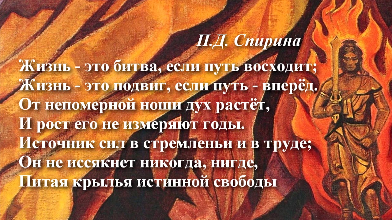 ЖИЗНЬ — ЭТО БИТВА, ЕСЛИ ПУТЬ ВОСХОДИТ... Наталия Спирина Жизнь — это битва, если путь восходит; Жизнь — это подвиг, если путь — вперёд. От непомерной ноши дух растёт, И рост его не измеряют годы. Источник сил в стремленье и в труде; Он не иссякнет никогда, нигде, Питая крылья истинной свободы. #НаталияСпирина, #ПоэзияНовойЭпохи, #ПоэзияСпириной -------------------------------------------- О Наталии Дмитриевне Спириной: Сайт, посвященный Н.Д. Спириной: https://spirina.info Раздел на сайте СибРО: http://sibro.ru/teacher/spirina/ Telegram: https://t.me/SpirinaN Видеофильмы о Н.Д. Спириной: https://www.youtube.com/playlist?list=PLRDwJtqWLAx7zdjQRW1u5QSUW3T6SJ4rj -------------------------------------------- Помочь проектам СибРО: https://sibro.ru/dari-dobro/ Благодарим наших постоянных помощников! -------------------------------------------- Канал Сибирского Рериховского Общества и Музея Николая Рериха в Новосибирске https://www.youtube.com/channel/UCOy_IPfEW_uKJU7lY6HwEaA Канал Трансляции СибРО https://www.youtube.com/channel/UCtl9xwOporefIWfINDnFlKQ Сайт: https://sibro.ru Группы: VK https://vk.com/roerichmuseumnsk OK https://ok.ru/roerichmuseum Книги издательства СибРО "РОССАЗИЯ": https://rossasia.sibro.ru/knigi/ Интернет-магазин "Искры Света": https://knigisibro.ru