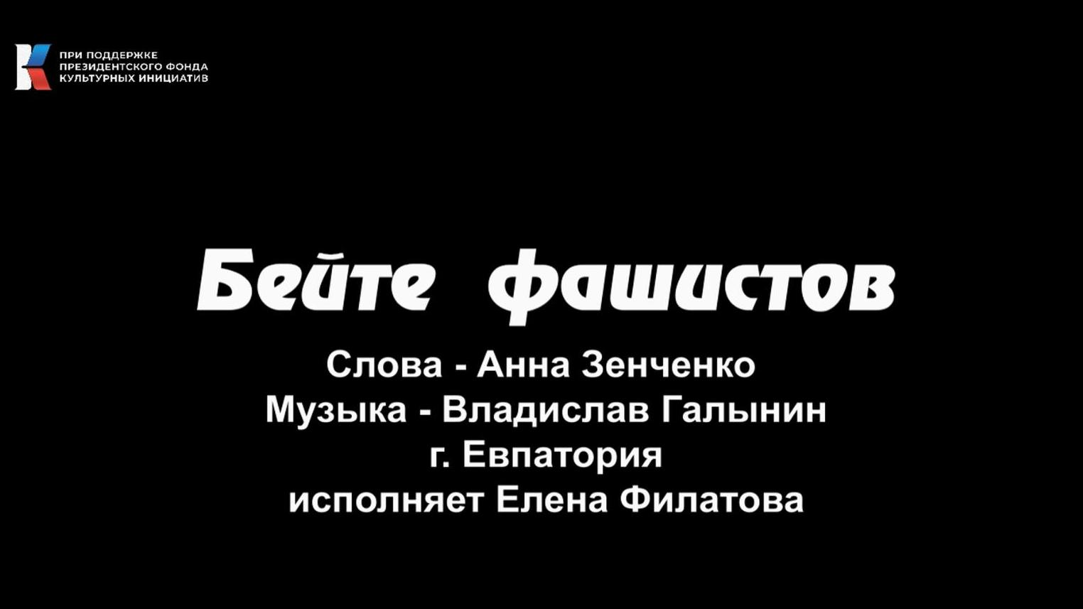 "Бейте фашистов" стихи - Анна Зенченко, музыка - Владислав Галынин, исполняет Елена Филатова ---------------------- Видео опубликовано на ресурсах акции "Позывной – Россия! Стихи и песни нового времени" с личного разрешения автора и не нарушает авторских и смежных прав. Положение об онлайн-акции "Позывной Россия": http://pskovpisatel.ru/?p=267388 #ПозывнойРоссия #МыВместе #Z #ФондКультурныхИнициатив #донбассзанами #СвоихНеБросаем