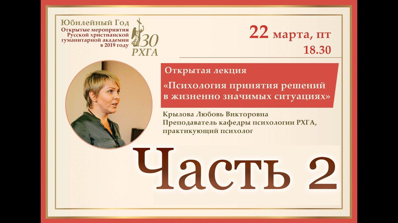 Открытая лекция Л.В.Крыловой на тему "Психология принятия решений в жизненно значимых ситуациях". Крылова Любовь Викторовна - преподаватель кафедры психологии РХГА, аспирант, практикующий психолог. Мы приглашаем Вас стать студентом Русской Христианской гуманитарной академии. От личных усилий человека зависит развитие его дарований, способностей и талантов. Выбирая нашу академию среди многочисленных учебных заведений Петербурга, Вы выбираете программу, ориентированную на широкую гуманитарную образованность, которая позволяет выпускнику быть не только специалистом, но и интеллектуалом. Учиться в РХГА трудно, но интересно. Образование -- это процесс изменения образа мыслей, чувства, действия, проходящий в человеческой душе. Поэтому мы искренне желаем Вам, чтобы выбор вашего пути и образования был свободным, осмысленным, ответственным. Ждём Вас в нашей академии!
