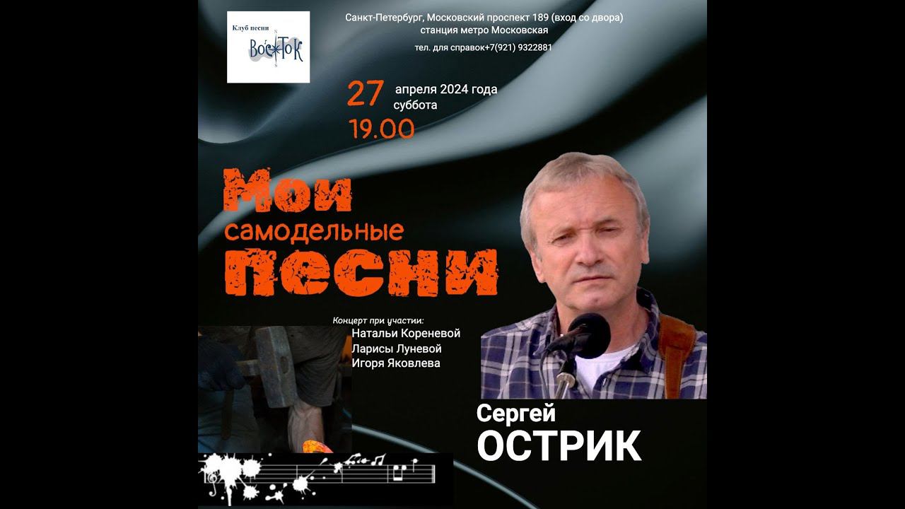 Сергей Острик при участии Натальи Кореневой, Ларисы Лунёвой и Игоря Яковлева. «Мои самодельные песни». Клуб песни «Восток». 27 апреля 2024 г. Видеозапись - Алла Левитан. Запись звука - Геннадий Демин. Санкт-Петербург, Московский пр., д. 189.
