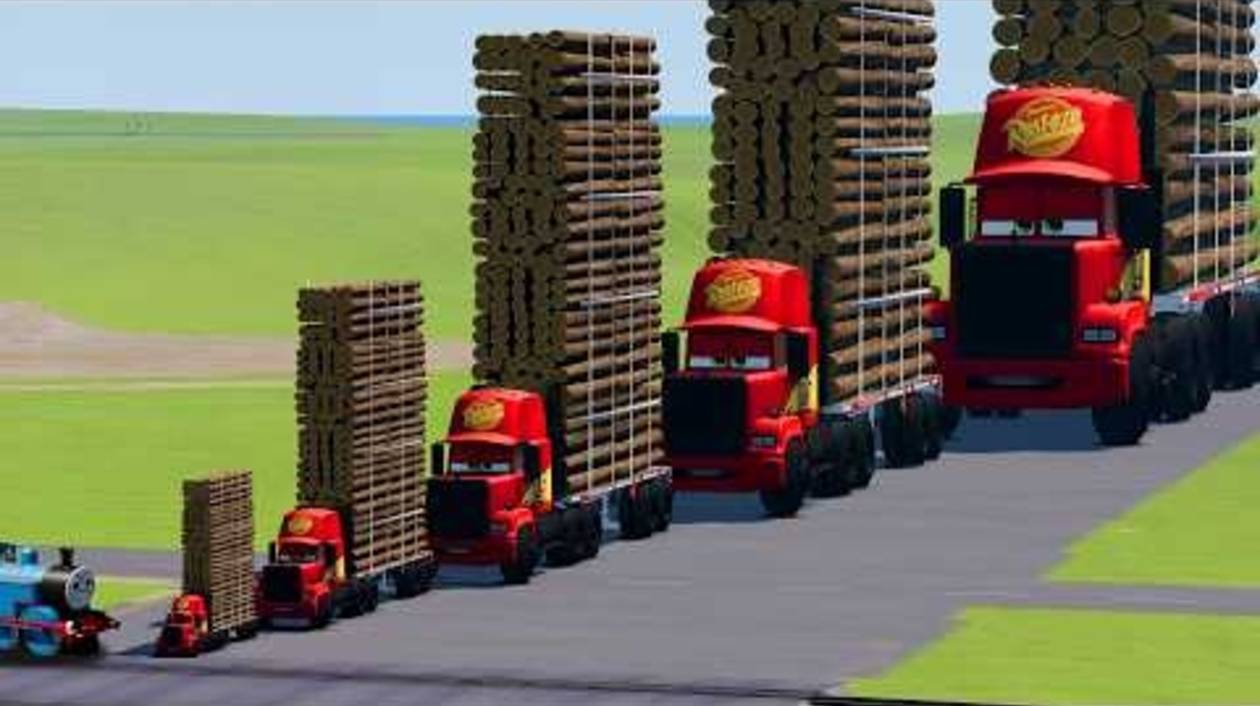 Большой и маленький грузовик Mack с высоким прицепом для перевозки бревен против поезда Thomas | Bea