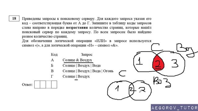 Разбор задания № 18 Демо варианта 2018 по ОГЭ информатике и ИКТ Тема задачи "Поисковые запросы в Интернете" Добавляйтесь в группу https://vk.com/aegorov_tutor Предложить задачу для разбора https://vk.com/topic-116207750_38371445 Задать вопрос по задаче из ОГЭ https://vk.com/topic-116207750_37403077