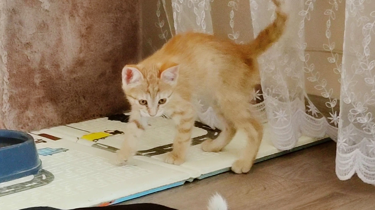 Котенок Мия играет под занавеской.