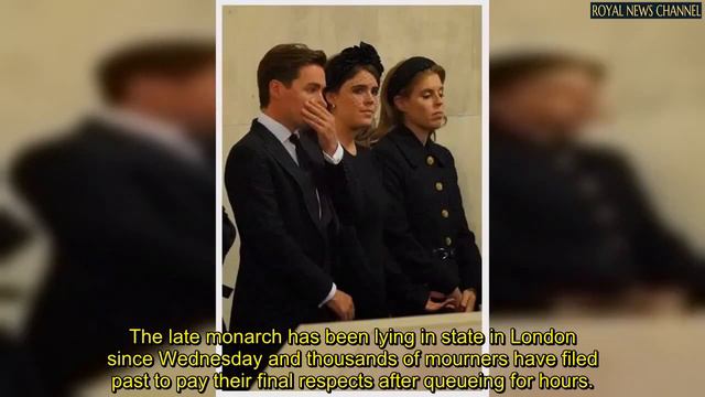 Princess Beatrice and Eugenie watched as their father, Prince Andrew and King Charles III led a vigil in memory of Queen Elizabeth II this evening. The royals had solemn looks on their faces as they mourned their late grandmother.