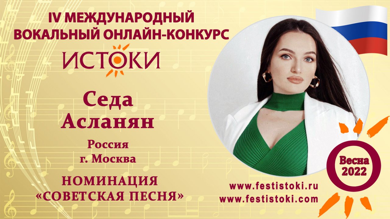 Лауреат I степени IV Международного вокального онлайн-конкурса «Истоки».Весна-2022. Номинация "Советская песня". Песня "Верни мне музыку". Слова А. Вознесенского, музыка А. Бабаджаняна. Сайт: www.festistoki.ru / www.festistoki.com E-mail: festistoki@mail.ru