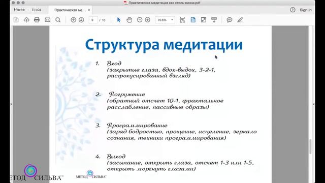 http://www.metodsilva.ru/uroki В этом видео Ирина Хлимоненко рассказывает о структуре выполнения медитации, и как применить медитацию в любое время в течение дня, независимо от того, где вы находитесь. Данный отрывок взят из вебинара «Практическая медитация как стиль жизни». С расписанием вебинаров, семинаров и других обучающих программ можно ознакомиться тут: http://www.metodsilva.ru/events-2