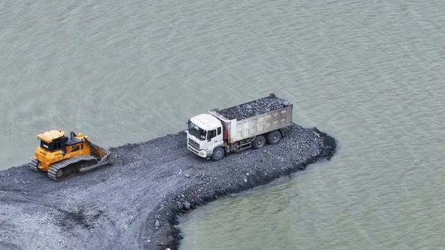 Бульдозер SHHANTUI, толкающий камни в воду, и грузовик SHACMAN.
