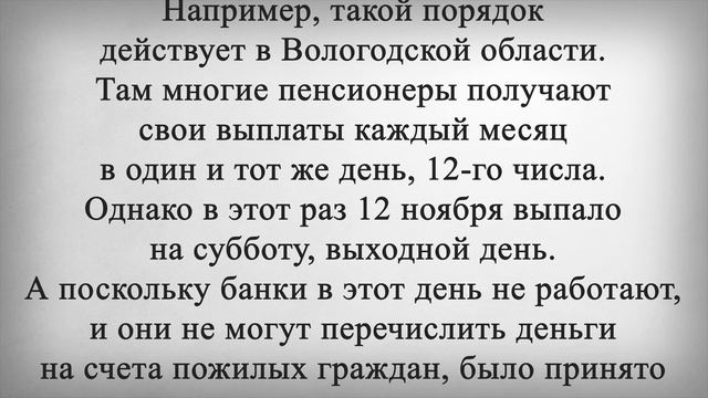 ГРАФИК Выдачи Пенсий с 11 Ноября! Россиянам рассказали о денежной выплате, которая будет поступать от Пенсионного фонда (ПФР) уже сегодня. Деньги будут зачисляться на банковские карты граждан в течение 11 ноября. При этом в минимальном объеме они составят 12 тысяч рублей. По словам специалистов фонда, речь идет о пенсиях и других социальных выплатах по линии ведомства. Уже в пятницу, 11 ноября, выплаты от ПФР смогут получить многие граждане, которым деньги должны были прийти лишь двенадцатого числа. Например, такой порядок действует в Вологодской области. Там многие пенсионеры получают свои выплаты каждый месяц в один и тот же день, 12-го числа. Однако в этот раз 12 ноября выпало на субботу, выходной день. А поскольку банки в этот день не работают, и они не могут перечислить деньги на счета пожилых граждан, было принято решение перевести средства досрочно. Специалисты уточнили, что в течение пятницы деньги будут поступать на банковские карты россиян: кто-то получит выплату в первой половине дня, а кому-то средства будут зачислены после обеда. При этом размеры поступающих денег будут индивидуальными, но никто из пенсионеров не получит меньше прожиточного минимума. В той же Вологодской области этот показатель составляет 12 091 рубль. А это значит, что пожилые граждане получат минимум по 12 тысяч рублей уже до наступления выходных. Важно знать, что прожиточный минимум пенсионера в каждом субъекте Российской Федерации свой, а график доставки пенсий периодически меняется, ставьте лайк если хотите, что бы мы всегда сообщали об их изменении, и напишите, о чём Вы бы ещё хотели узнать?