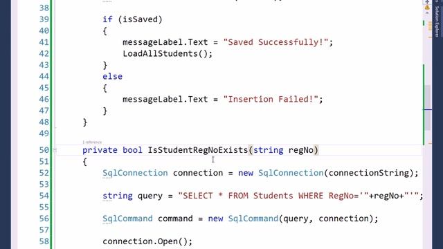 Database with example about Unique Constraint RegNo Exists Connection String to Web Config