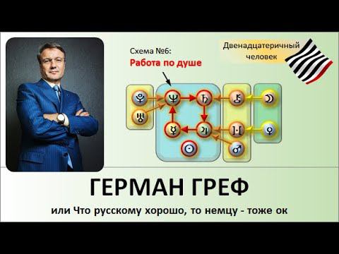 Обзор личности и биографии современного нам государственного деятеля, Германа Грефа. Акцент сделан на схеме №6, которая отвечает за работу по душе - из нее ясно, что Герман Греф должен работать креативным управляющим ресурсами, что ему и удается.
