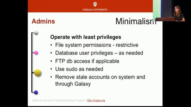 Galaxy Community Conference 2016, Indiana University - Bloomington | https://gcc2016.iu.edu/ https://gcc16.sched.com/event/b88f6fd952aa29dfdb5238e29d12baf # Authors Carrie Ganote, Indiana University Abstract One of the major users of bioinformatics pipelines is the medical field. This poses a challenge for system administrators and software developers who provide web-facing services - securing the client's data. Certain data sets in genomics can be considered sufficiently identifiable and thus qualify as electronic protected health information (ePHI), which is then further protected by HIPAA (Health Insurance Portability and Accountability Act). This talk will be an outline of hurdles associated with making Galaxy robust in a clinical setting. Best practices leverage a two-tiered approach at both operating system and application layers. Initially, systems configuration will be explored including least privilege for service accounts and database users, encryption of files, and system access. Later, best uses of Galaxy will be highlighted as they apply to moving data, storage, and account policies, following a rigorous NIST-based cyber risk management framework. Speaker: Carrie Ganote Indiana University