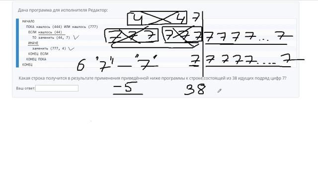 http://egoroffartem.pythonanywhere.com/ege/task/14 На сайте размещены другие задания по этой теме http://egoroffartem.pythonanywhere.com/ege/videotask/14 Список всех разборов 14 задания из ЕГЭ по информатике: https://www.egoroffartem.ru/ege/videotask/ Видео решения задач по ЕГЭ информатике https://vk.com/egoroff_channel В данном группе можете найти информацию о новых видео и задать вопросы по ЕГЭ Информатике Дана программа для исполнителя Редактор: НАЧАЛО ПОКА нашлось (444) ИЛИ нашлось (777) ЕСЛИ нашлось (44) ТО заменить (44, 7) ИНАЧЕ заменить (777, 4) КОНЕЦ ЕСЛИ КОНЕЦ ПОКА КОНЕЦ Какая строка получится в результате применения приведённой ниже программы к строке,состоящей из 38 идущих подряд цифр 7? Разбор задания № 14 ЕГЭ ИНФОРМАТИКА Тема задачи "Анализ и выполнение алгоритмов для исполнителя"