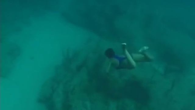 Купальщица плавает в морской воде на дном моря.