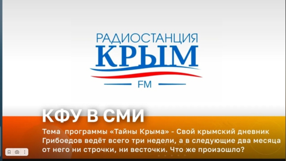 Радио «Крым». В эфире – доцент Института филологии КФУ им. В.И. Вернадского Сергей Минчик Свой крымский дневник Грибоедов ведёт всего три недели, а в следующие два месяца от него ни строчки, ни весточки. Что же произошло с ним во время этого путешествия, и по каким причины он мог хранить столь долгое молчание?