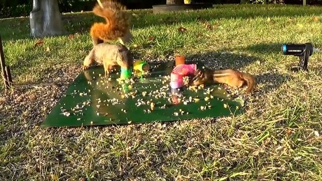 Домашняя белка отогнала от своей еды дикую белку.